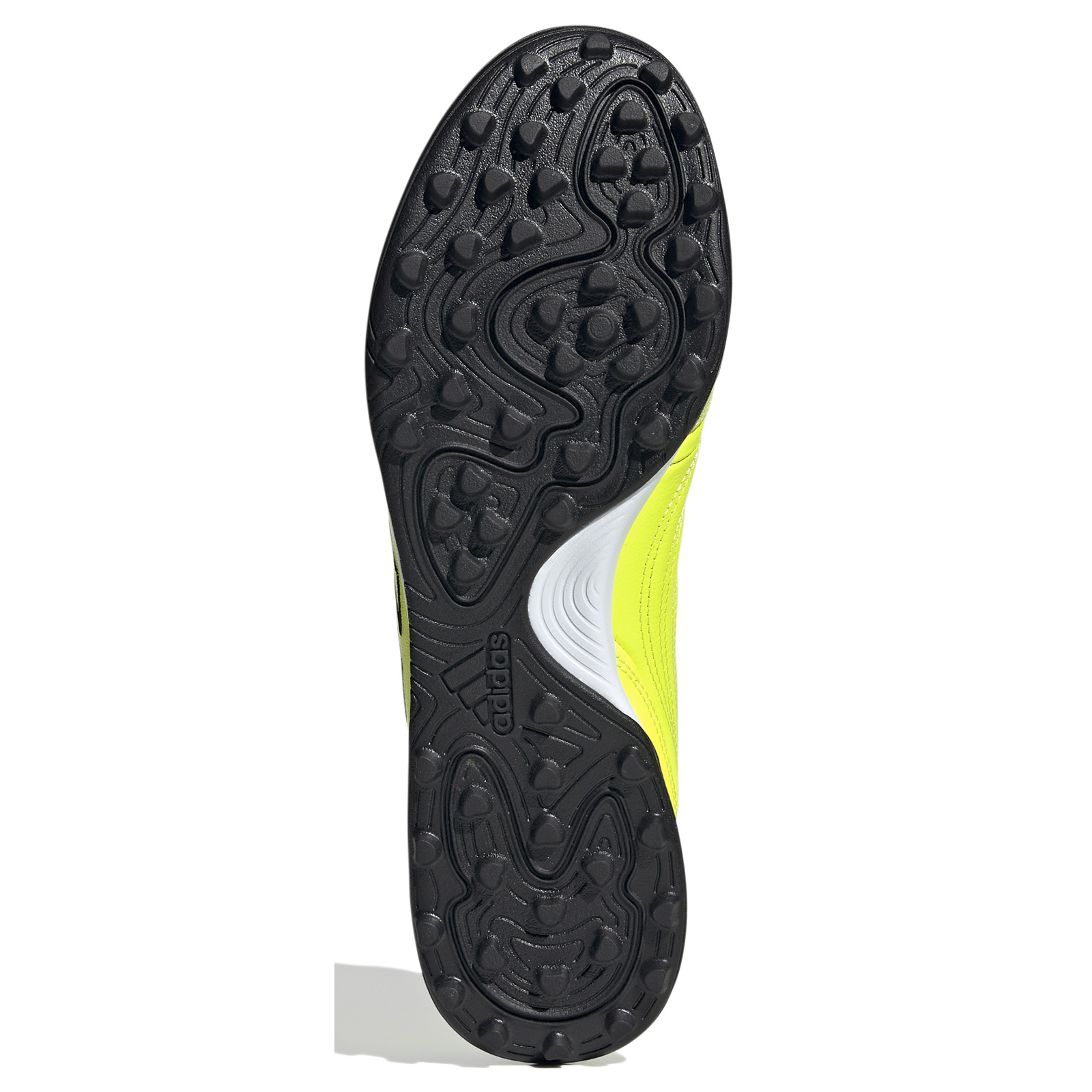 Rubber turf outsole made for superior traction on dry hard natural surfaces and artificial surfaces.