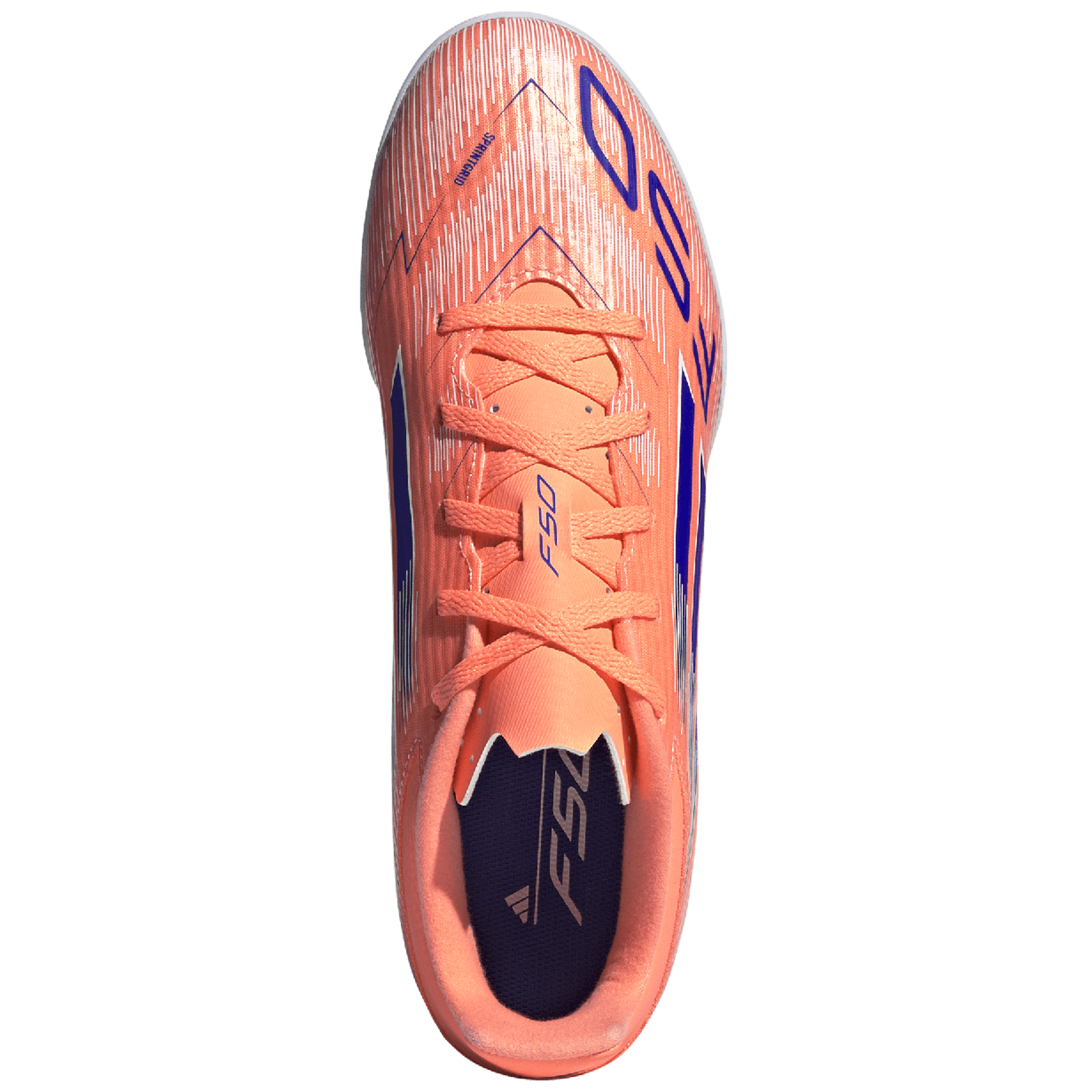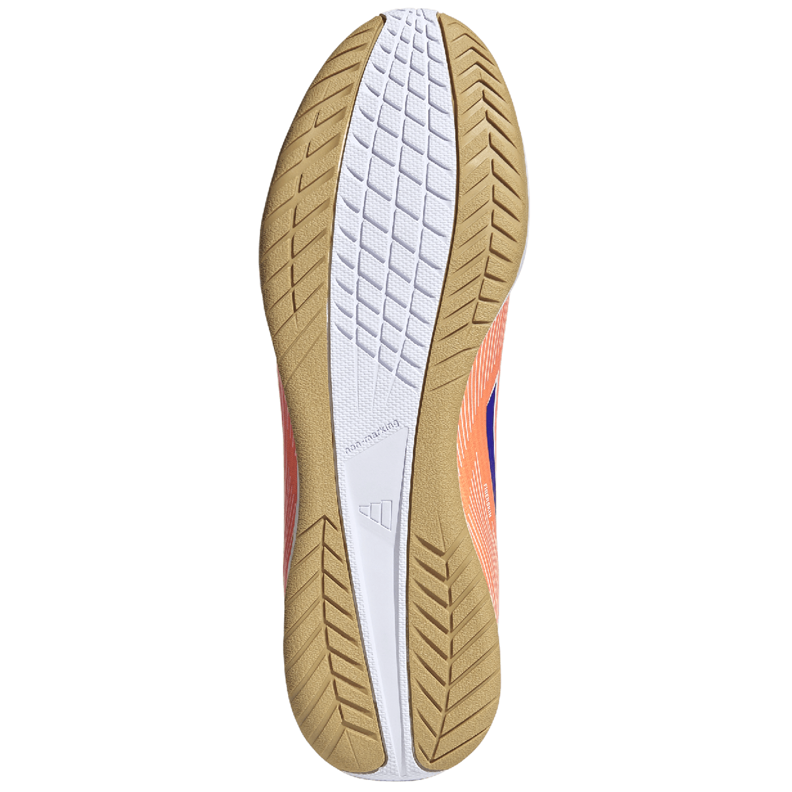 Welcome back an old friend with an original new style and unsurpassed execution. The adidas F50 Club Indoor Soccer Shoes (Beam Orange/Lucid Blue/Cloud White) sit on a full-length rubber outsole which offers maximum grip to cut, swerve and score on artificial ground. Premium easy-wearing 3D textured textile upper furnishes an amazing touch on the ball.
