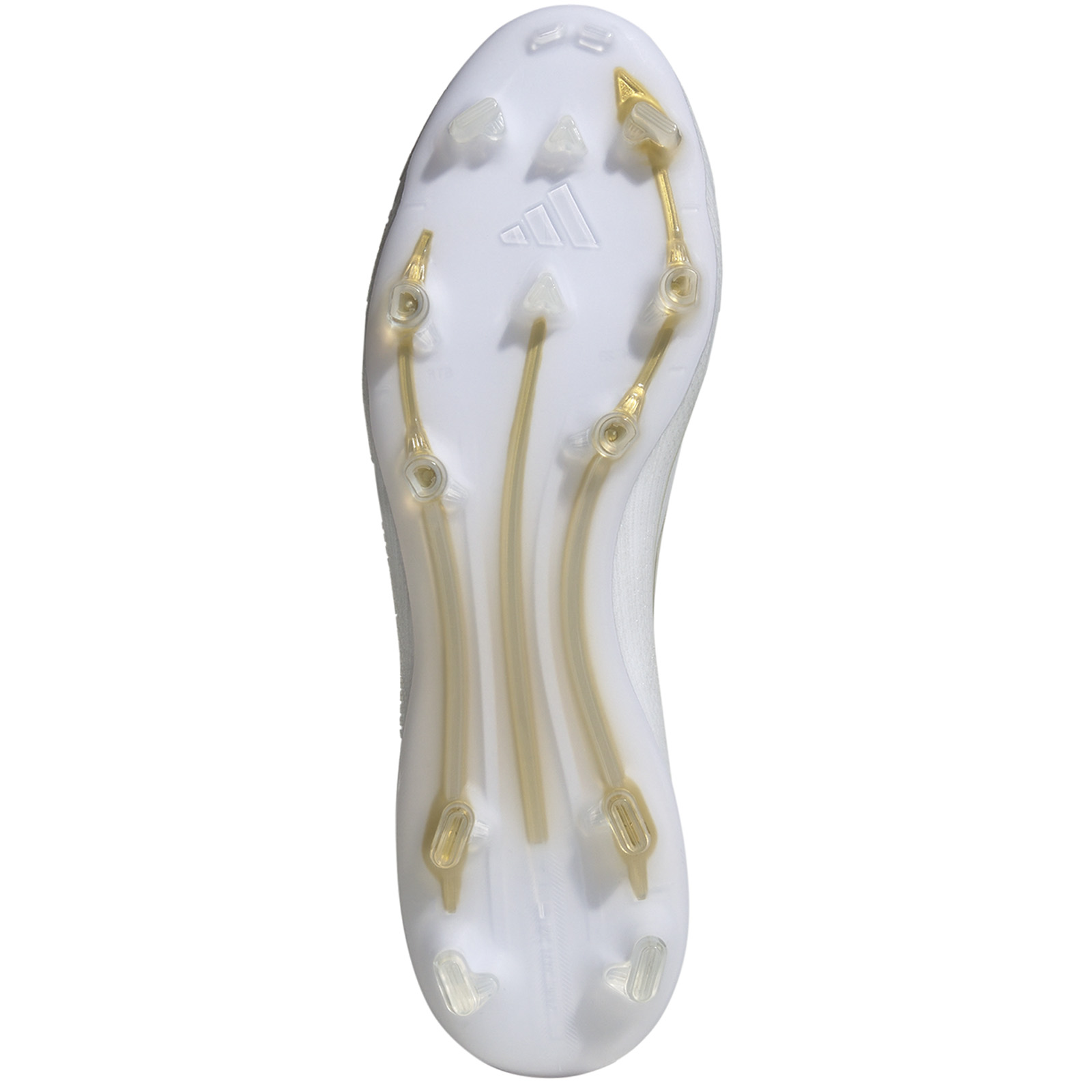 Welcome back an old friend with an novel new style and unsurpassed efficiency. The adidas F50 Pro FG Soccer Cleats (Cloud White/Gold Metallic/Cloud White) sit on a full-length Sprintshell 360 outsole which offers stability to cut, swerve and score on firm ground. The Fibertouch upper includes Sprintweb 3D texturing for rapid dribbling touch.