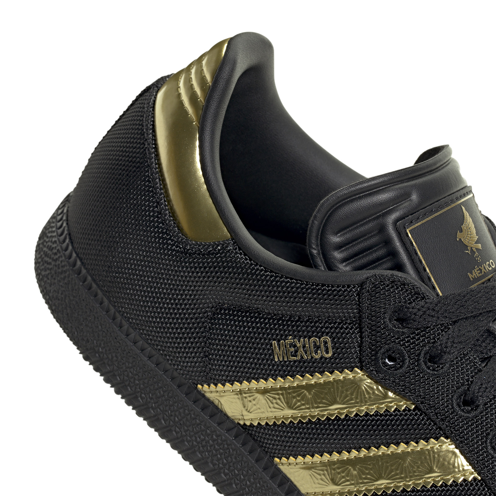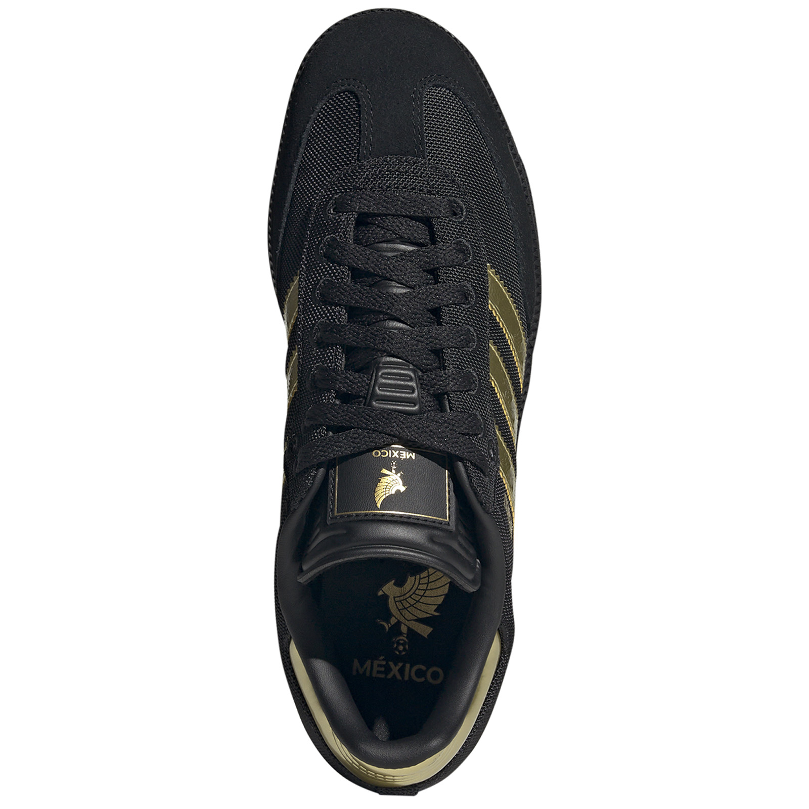 Stand out on the field with the striking adidas FMF Mexico Samba Indoor Soccer Shoes (Black/Gold), part of adidas' special Mexico collection. Featuring a commemorative emblem that complements the bold match kit and culture wear apparel, they offer lasting comfort with a breathable mesh upper and a grippy rubber outsole for reliable traction.