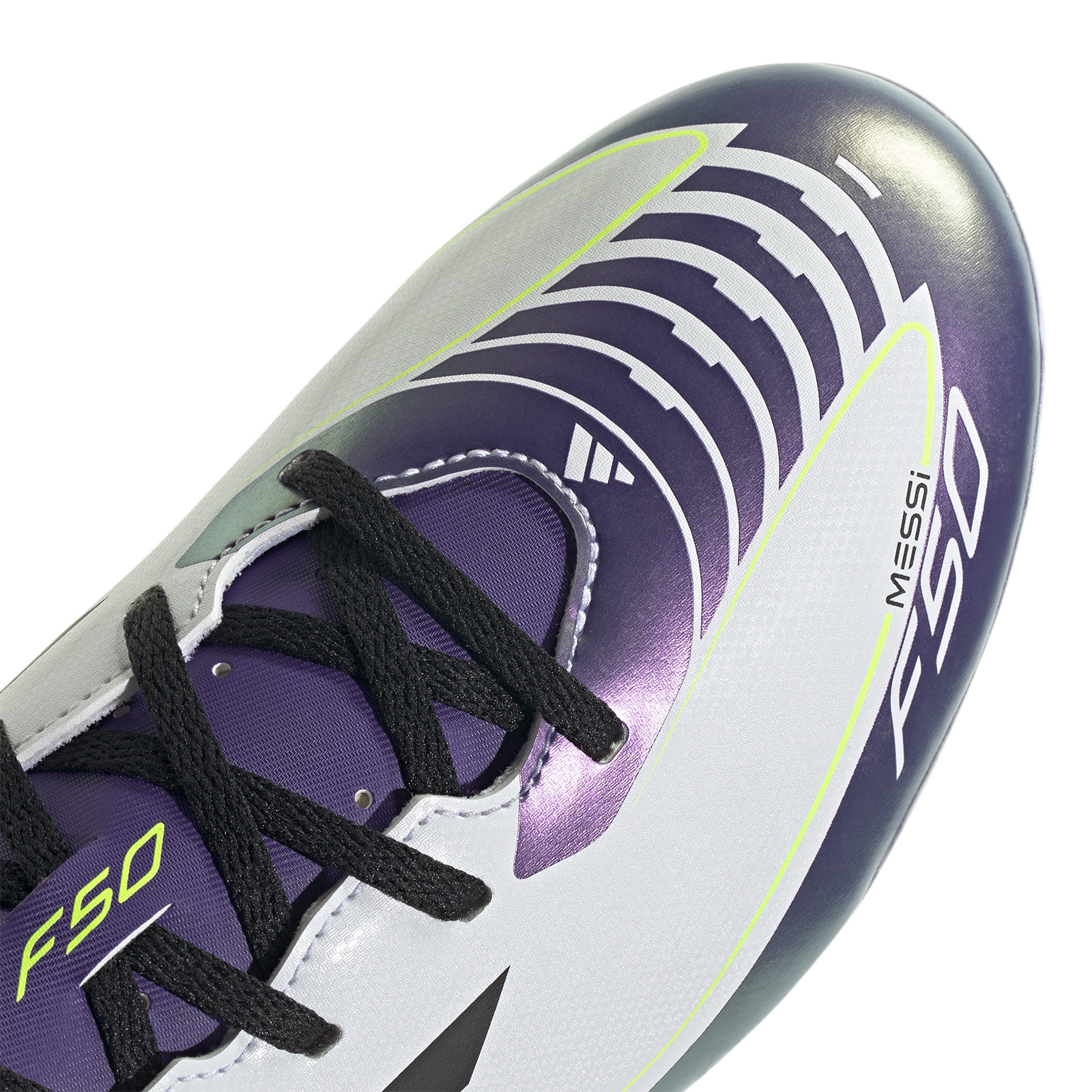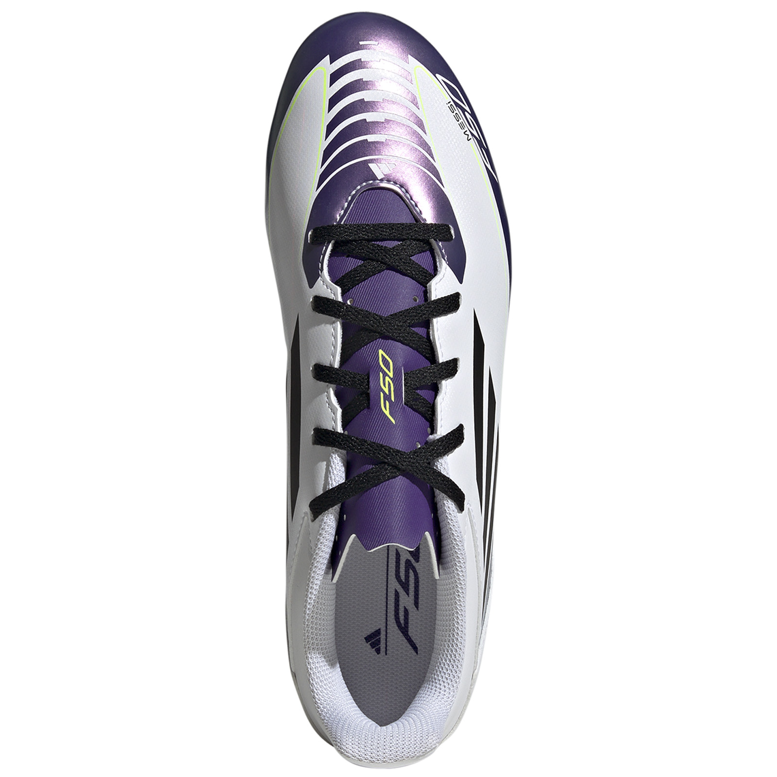 Precision construction allows power transfer for the perfect strike and ball regulation in the creative adidas Lionel Messi F50 Club FG Soccer Shoes (Cloud White/Core Black/Purple). Premium relaxing 3D textured textile upper allows an amazing touch on the ball. Combined with a grass-gripping firm ground outsole built for grip and regulation, these soccer cleats are certain to excel on matchday. These impressive football boots offer exceptional functionality and recent pattern for the most demanding player!