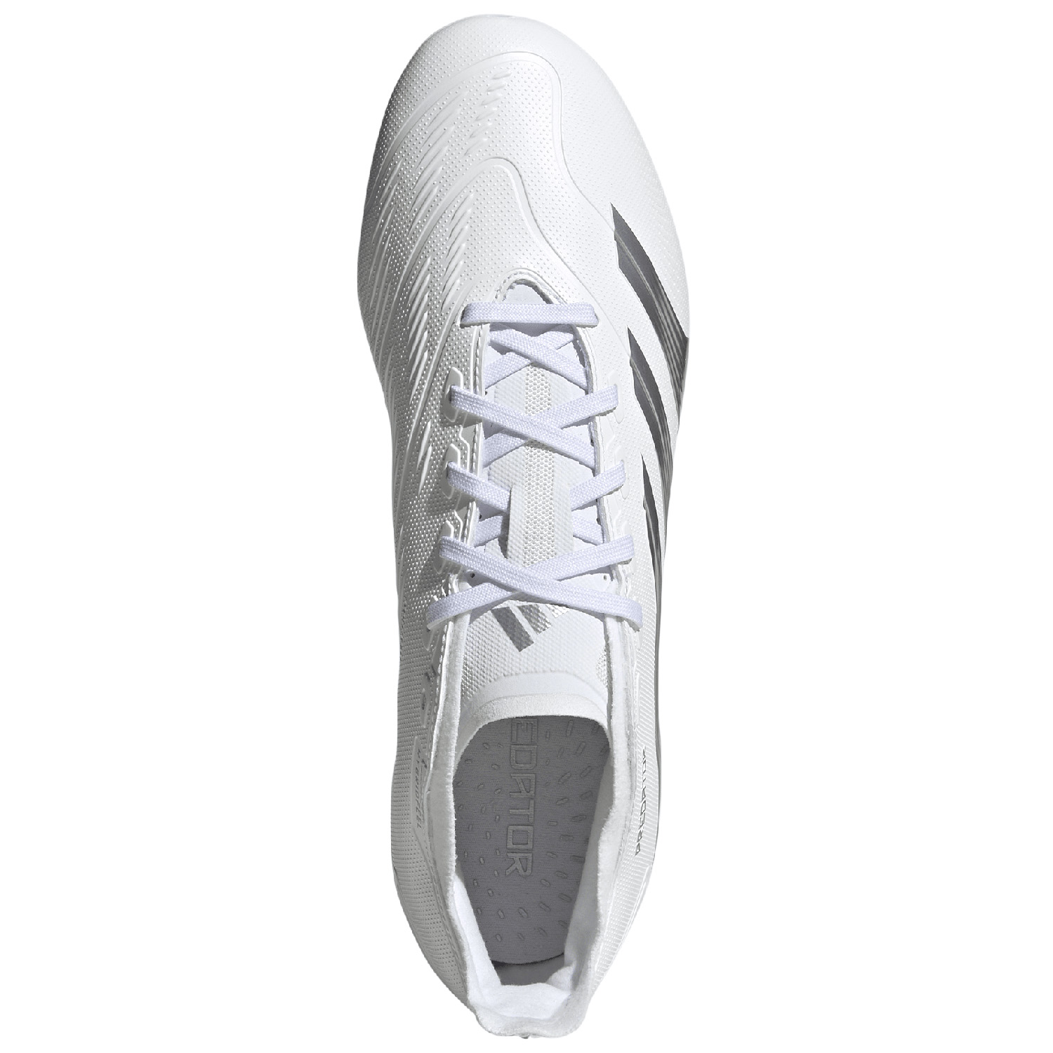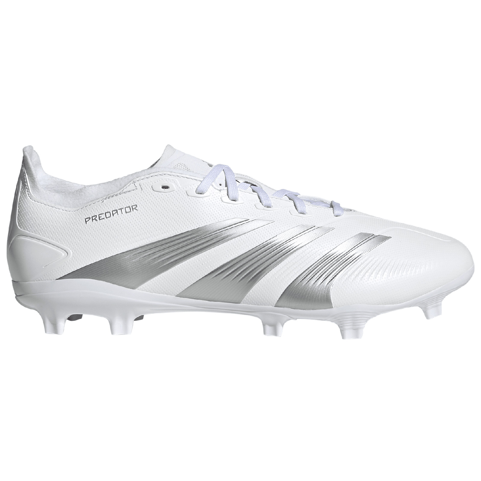 Target perfection and slam the door on your opponent in the blink of an eye. The adidas Predator 24 League FG Soccer Cleats (Cloud White/Silver Metallic/Grey One) sit on a full-length Controlplate 2.0 outsole which offer stability to cut, swerve and score on firm ground. The tough Hybridfeel upper is optimized for accuracy with 3D texture and grippy Strikescale fins.