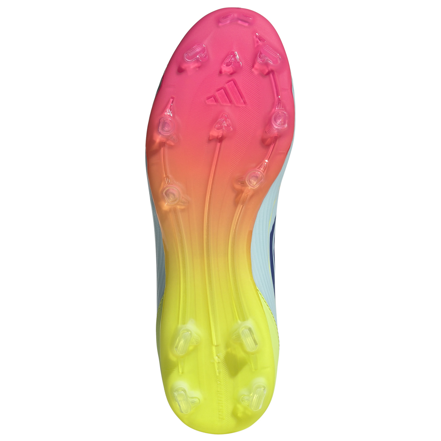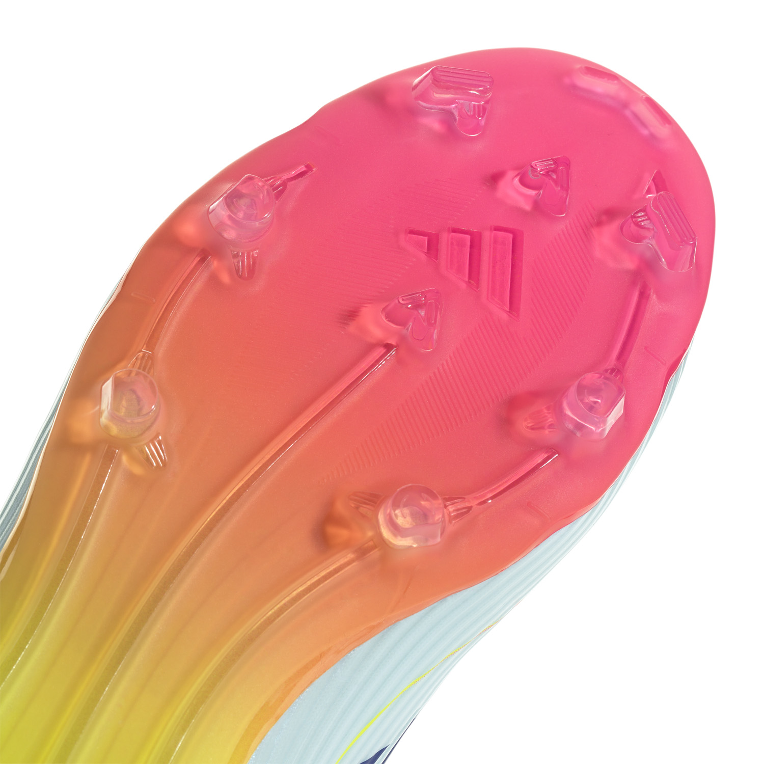 Free the fast with these female-specific adidas Womens F50 League Mid-Cut FG/MG Soccer Cleats (Almost Blue/Semi Lucid Blue/Semi Solar Yellow.) These lively soccer cleats feature a Sprintplate 360 outsole built for propulsion on multiple surfaces. The ultra lightweight Fiberskin upper is optimized for accuracy and touch on the ball.