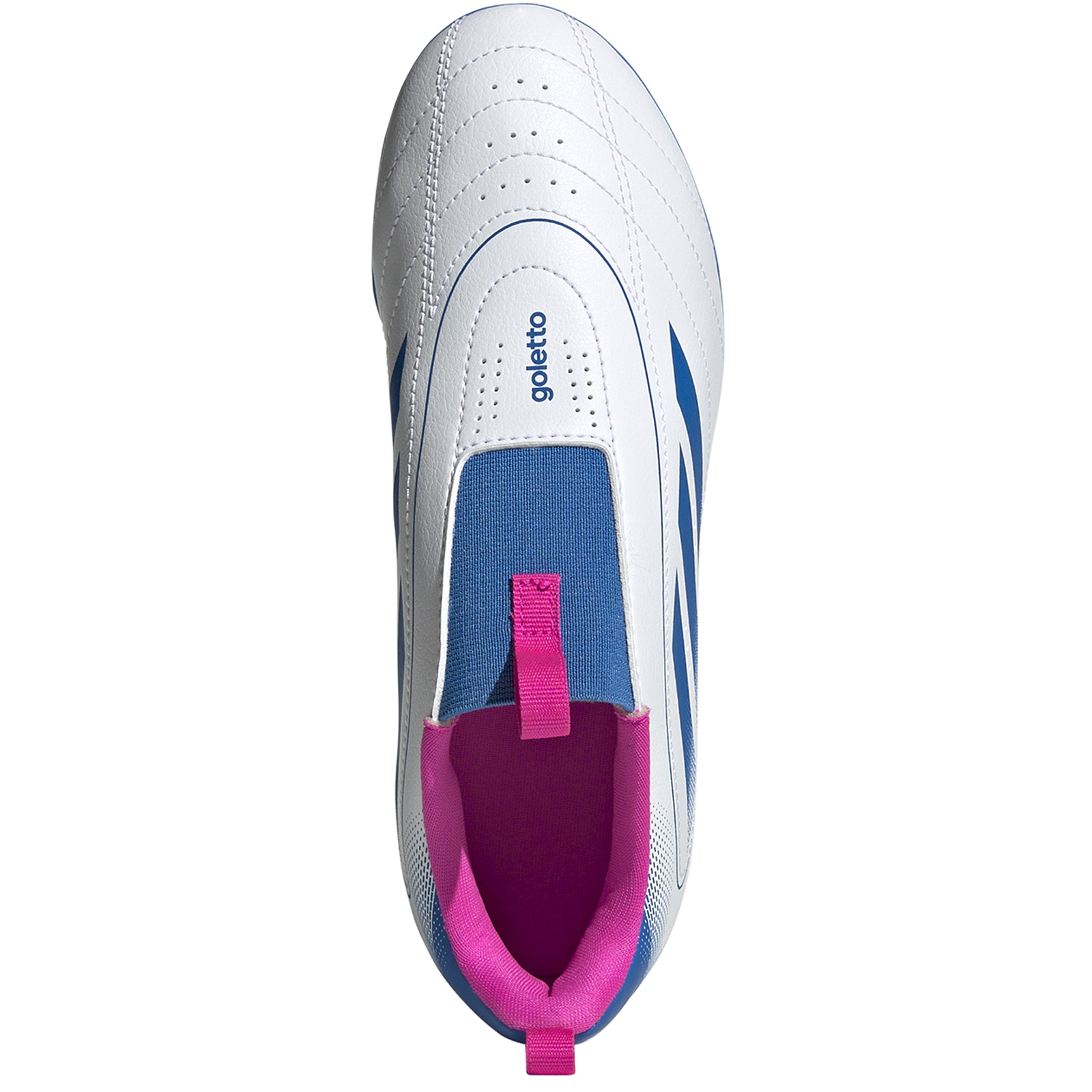 A vintage Adidas silhouette with a modern touch, the adidas Youth Goletto IX Laceless FG Soccer Shoes (White/Blue/Pink) let you shine on the pitch. A soft stretchy band offers laceless closure and a clean strike area. With a soft synthetic upper and versatile grass-gripping outsole, these high level football boots offer durability, vintage design and modern innovation for the most demanding player