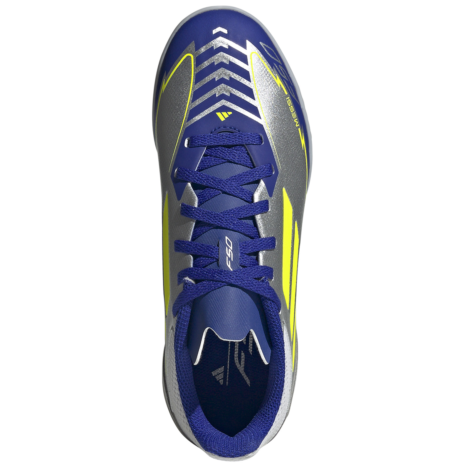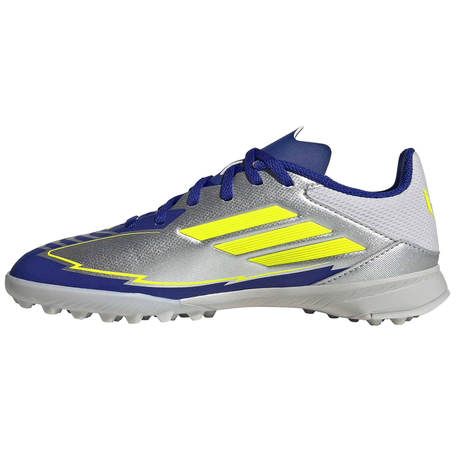 Precision construction allows power transfer for the perfect strike and ball governance in the groundbreaking adidas Youth Lionel Messi F50 League Turf Soccer Shoes (Silver Metallic/Solar Yellow/Lucid Blue). Premium cozy HybridTouch upper provides an amazing touch on the ball. Combined with a turf-gripping rubber outsole built for grip and governance, these soccer shoes are certain to excel on matchday. These impressive football boots offer exceptional efficiency and modern concept for the most demanding participant!