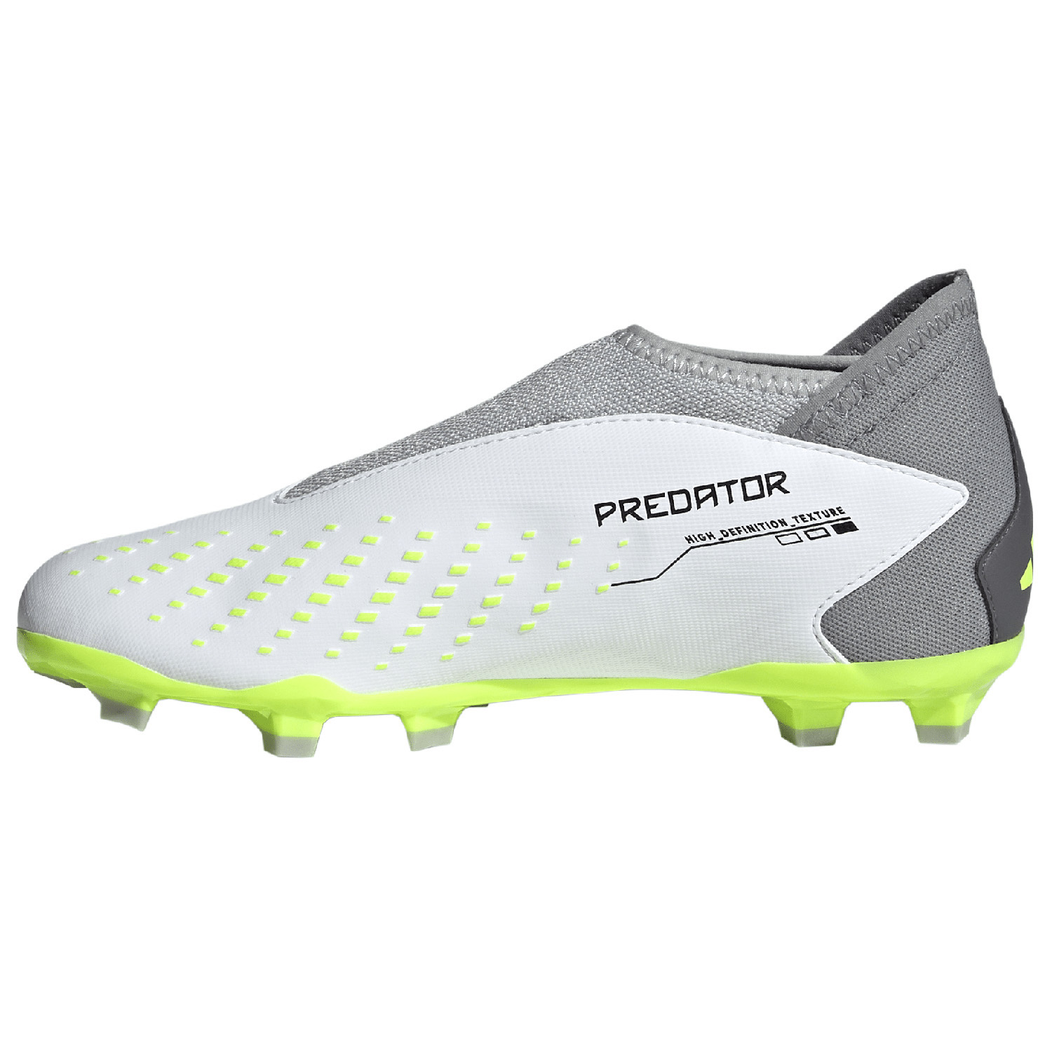 Laceless construction allows power transfer for the perfect strike and ball management in the novel adidas Youth Predator Accuracy.3 Laceless LL Firm Ground Soccer Shoes (Football White/Core Black/Lucid Lemon.) Premium comfortable mid-cut 3D textured textile upper allows an amazing touch on the ball. Combined with a grass-gripping firm ground outsole built for grip and management, these soccer cleats are certain to excel on matchday. These football boots offer exceptional execution and new design for the most demanding athlete!