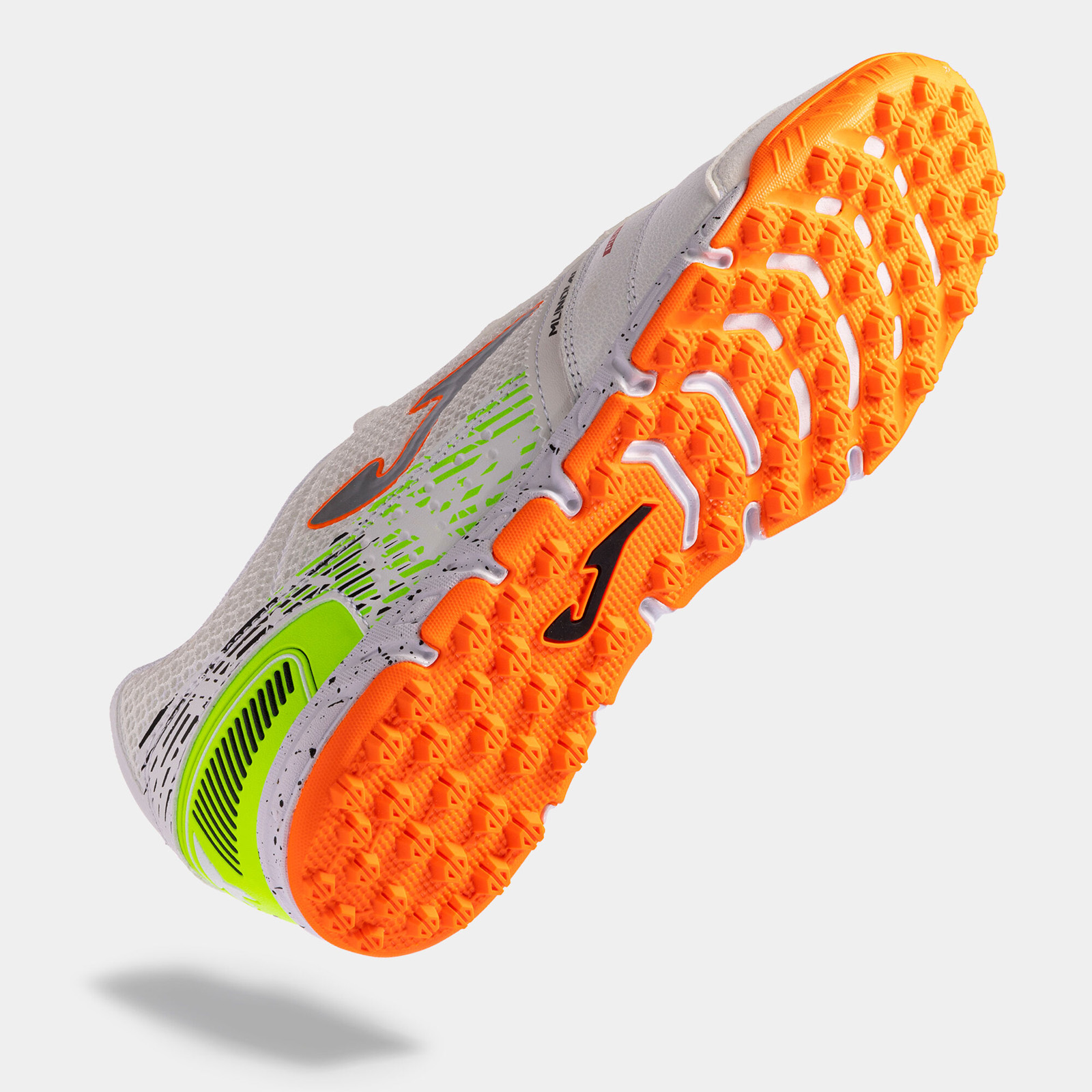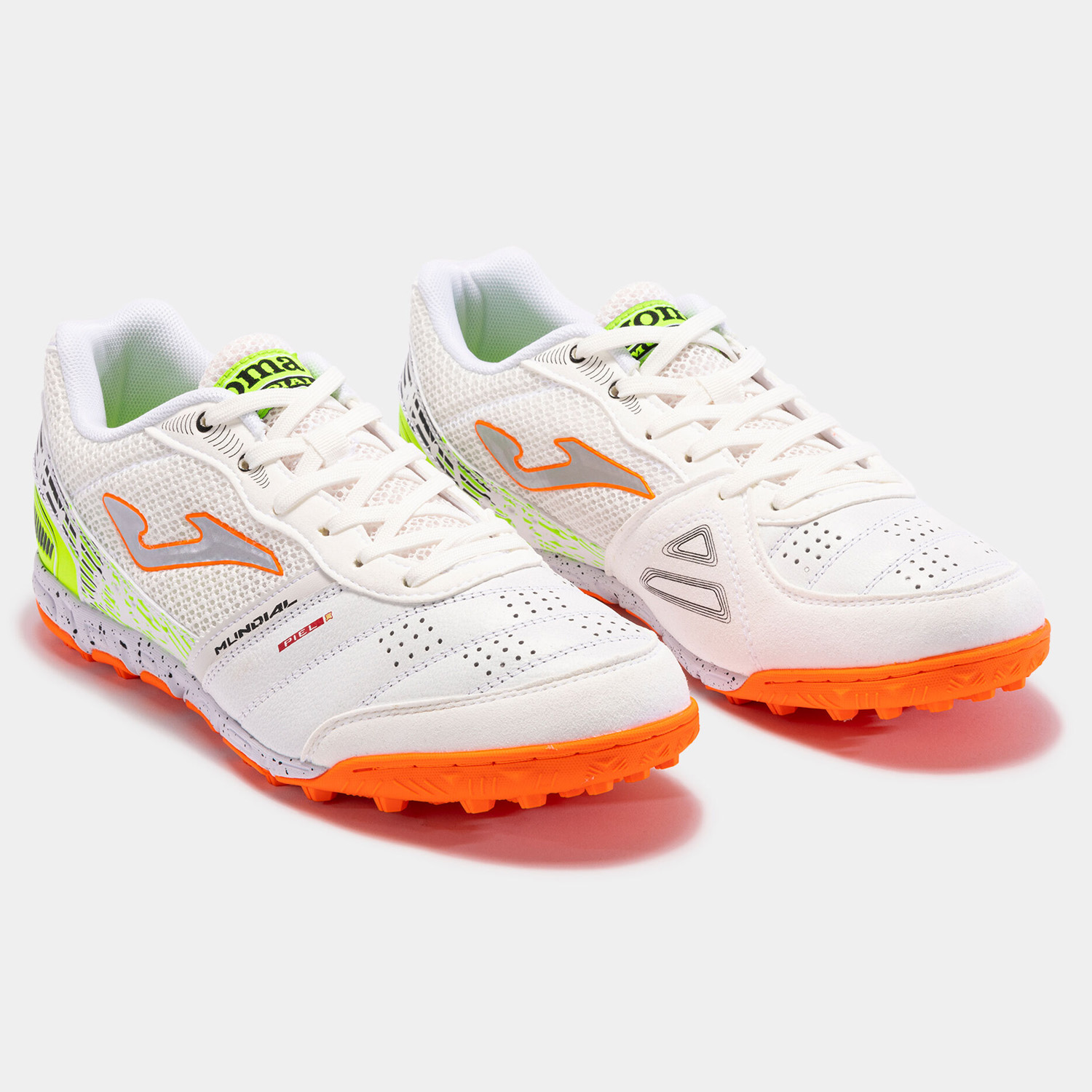 The Joma Mundial 2302 Turf Soccer Shoe (White/Coral Orange/Neon Yellow) is developed with lightweight comfort and flexibility in mind. This impressive turf soccer shoe has a pleasant upper developed to provide a soft touch and an outsole built for speed and traction on dry natural and artificial / synthetic surfaces.
