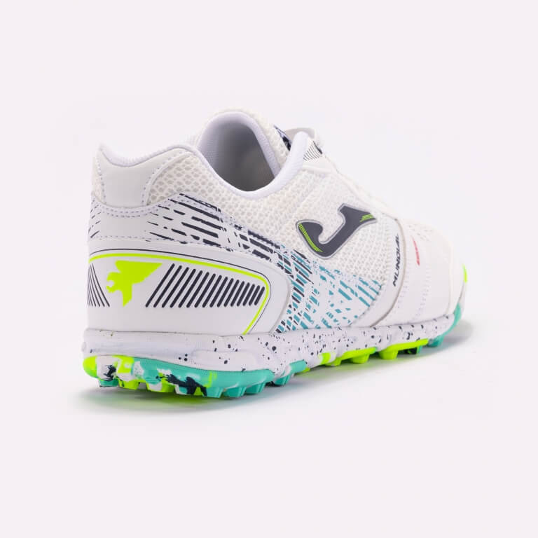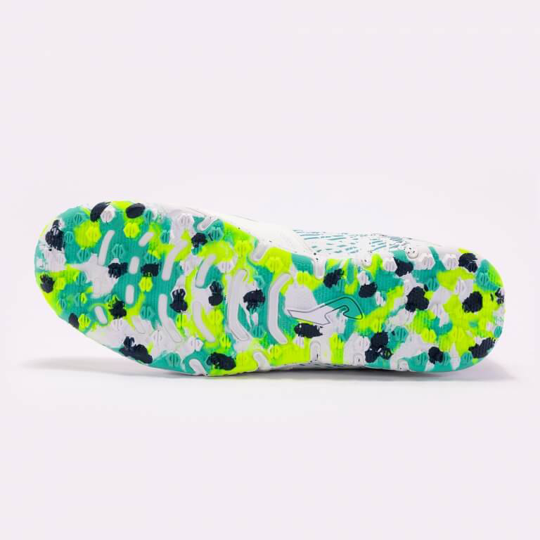 The Joma Mundial 2402 Turf Soccer Shoe (White/Neon Yellow/Aqua Blue) is fashioned with lightweight comfort and flexibility in mind. This impressive turf soccer shoe features a snug upper fashioned to provide a soft touch and an outsole built for speed and traction on dry natural and artificial / synthetic surfaces.