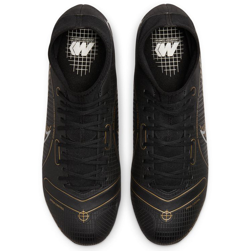Building on the innovation of its predecessors, the Nike Mercurial Superfly 8 Academy FG / MG Soccer Shoes (Black/Metallic Gold/Metallic Silver) combines a comfy ankle collar with conical studs which provide traction for razor sharp cuts and sudden starts and stops!