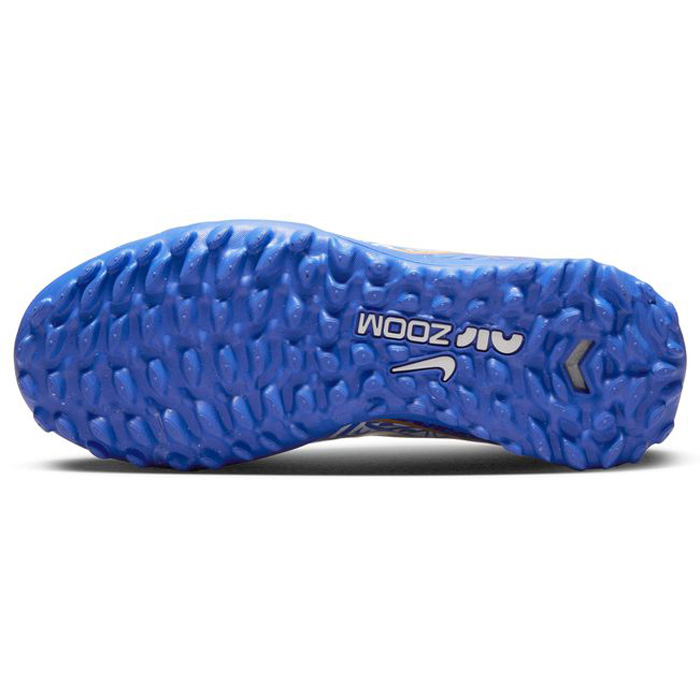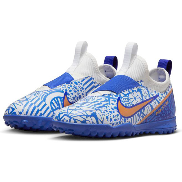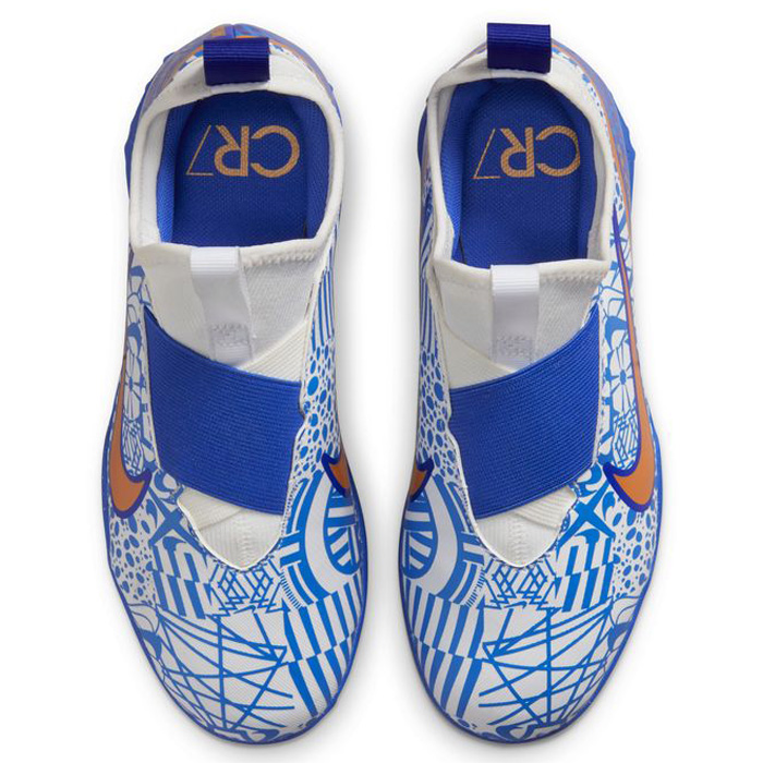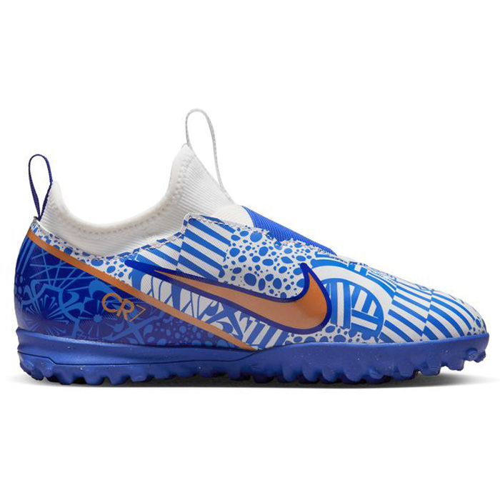 Bold new pattern coupled with active functionality, the Nike Youth CR7 Ronaldo Zoom Mercurial Vapor 15 Academy Turf (White/Metallic Copper/Concord Blue) contains a revolutionary Zoom Air unit for elite cushioning. Boasting bold pattern details and coming full loaded with a speed cage skeleton, this youth soccer turf boot is easy on the eyes and heaven on your feet!