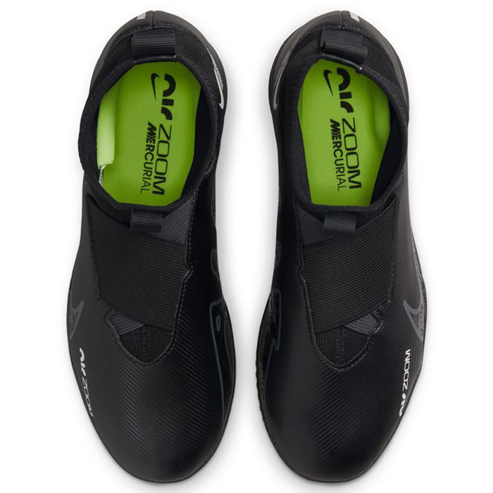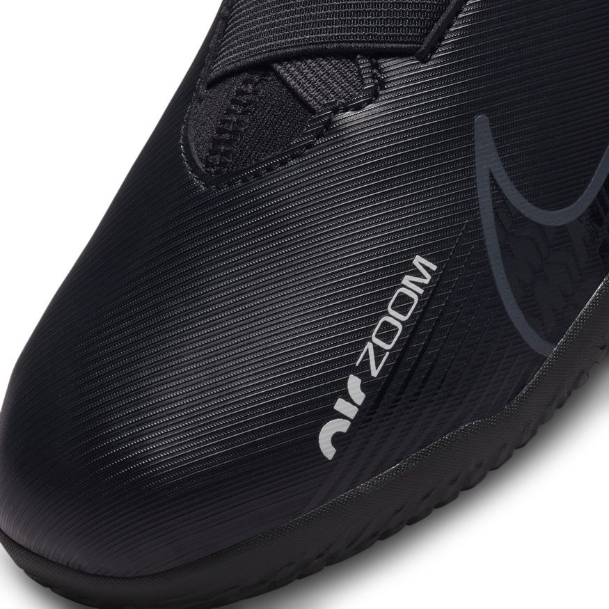 The Nike Youth Zoom Mercurial Superfly 9 Academy Laceless Indoor Soccer Shoes (Black/Dark Smoke Grey/Summit White) features an all-new Zoom Air unit for unsurpassed cushioning and responsiveness. Combining a comfy ankle collar and a gum rubber outsole which offers traction for razor sharp cuts, even the youngest players can dominate indoor matches!