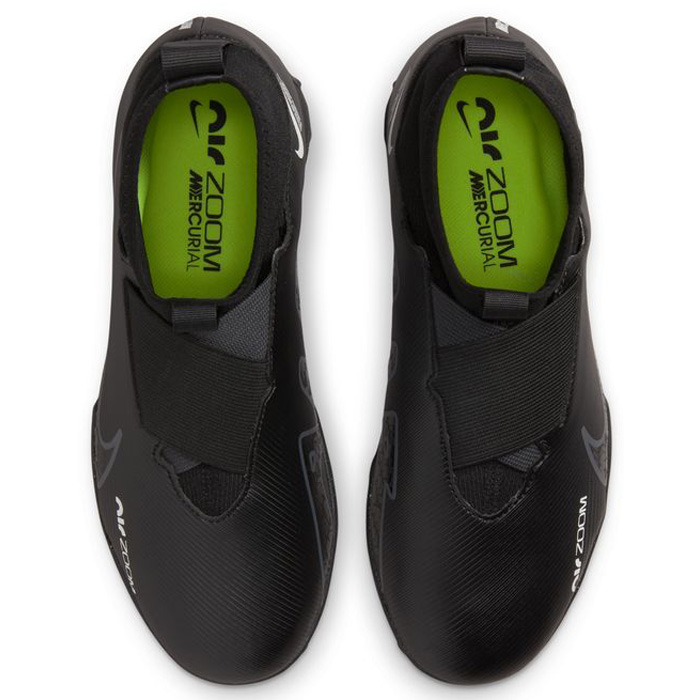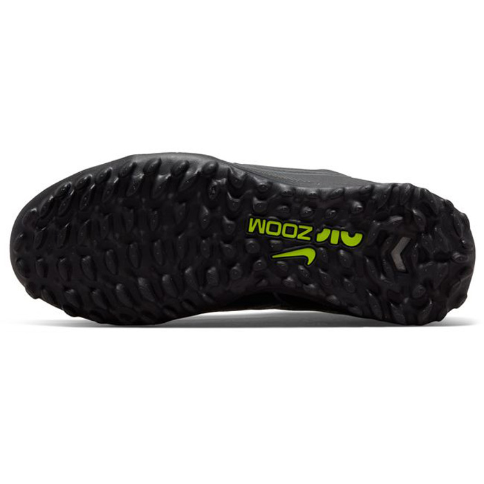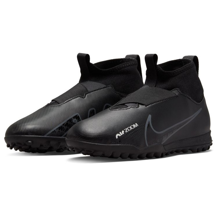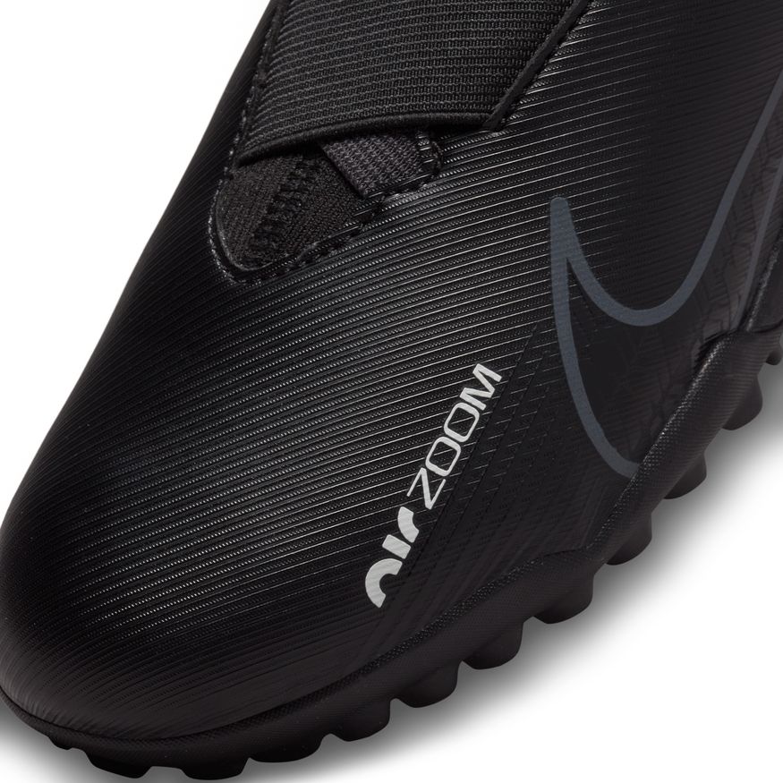 Speed is in the air. Bold new style coupled with forceful efficiency, the Nike Youth Zoom Mercurial Superfly 9 Academy Turf Soccer Shoes (Black/Dark Smoke Grey/Summit White) feature an improved molded, synthetic upper with a revolutionary Zoom Air unit!