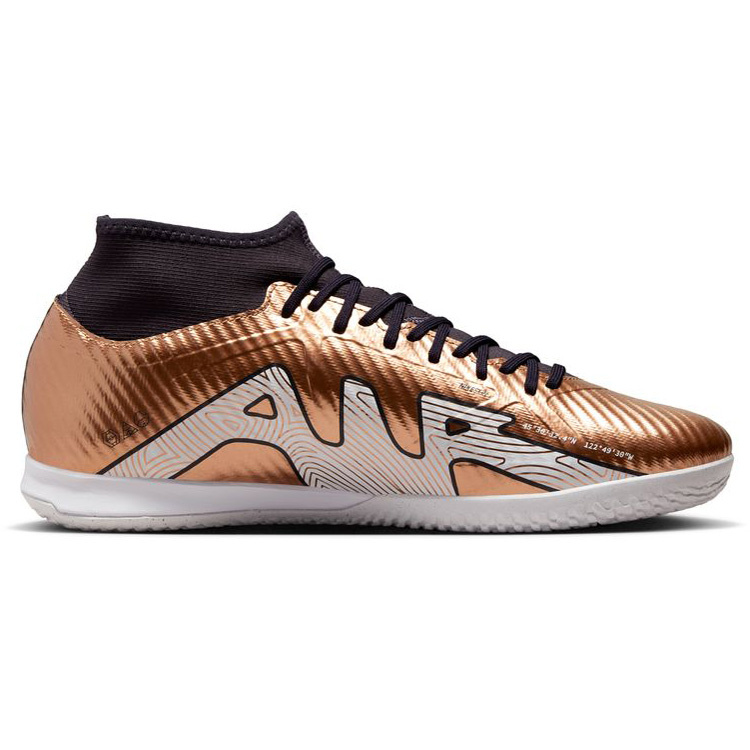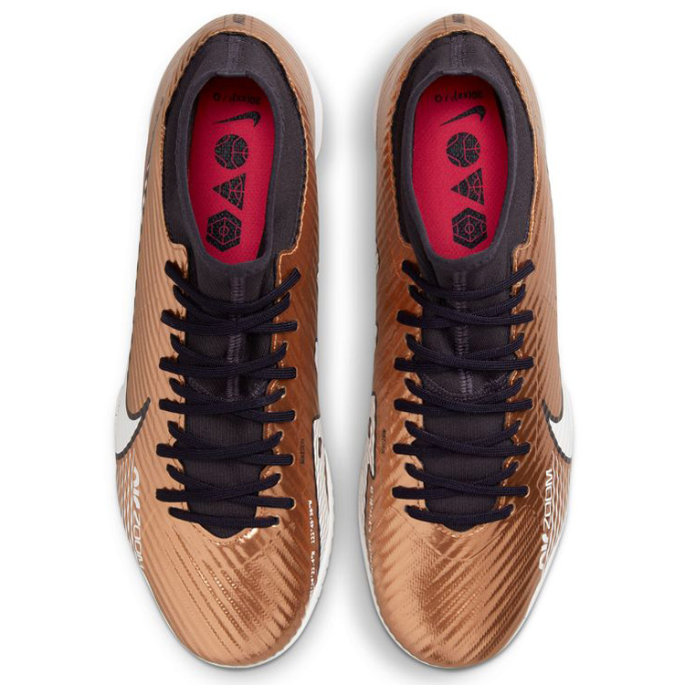Featuring a futuristic look to honor the worlds superior players, celebrate the global contest 2022 Qatar with these special edition Nike Zoom Mercurial Superfly 9 Academy Indoor Soccer Shoes (Metallic Copper/Black). These novel indoor shoes trait a comfy ankle collar with a rubber outsole to provide traction for razor sharp cuts and sudden starts and stops!